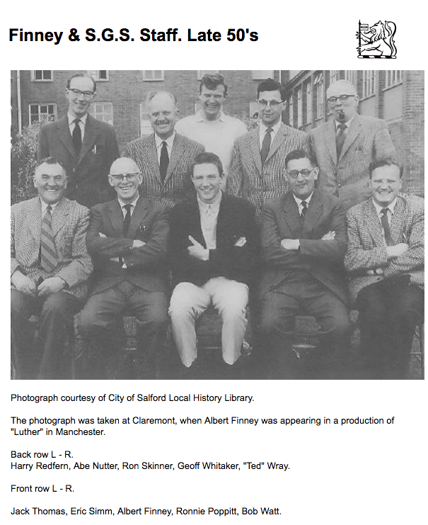 Widely acknowledged as the most famous of our famous Old Boys, Albert Finney bestrode stage and screen as one of the greatest actors this country has ever produced. Born in May 1936, Albert attended Leaf Square from 1947-52 and was a contemporary of former Old Salfordian Chairman Keith Ball. Salford Grammar had a reputation for its school plays and Albert’s potential as an actor was spotted very early as he became a mainstay on the school stage.