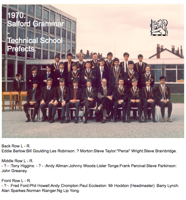Considered a great honour by many, and certainly everyday Salford Grammar School could not have functioned without the prefects. In the later years of the school they were distinguished by the addition of a gold trim to the blazer. It made them easier to spot if you were up to no good, not that anyone was ever up to no good.